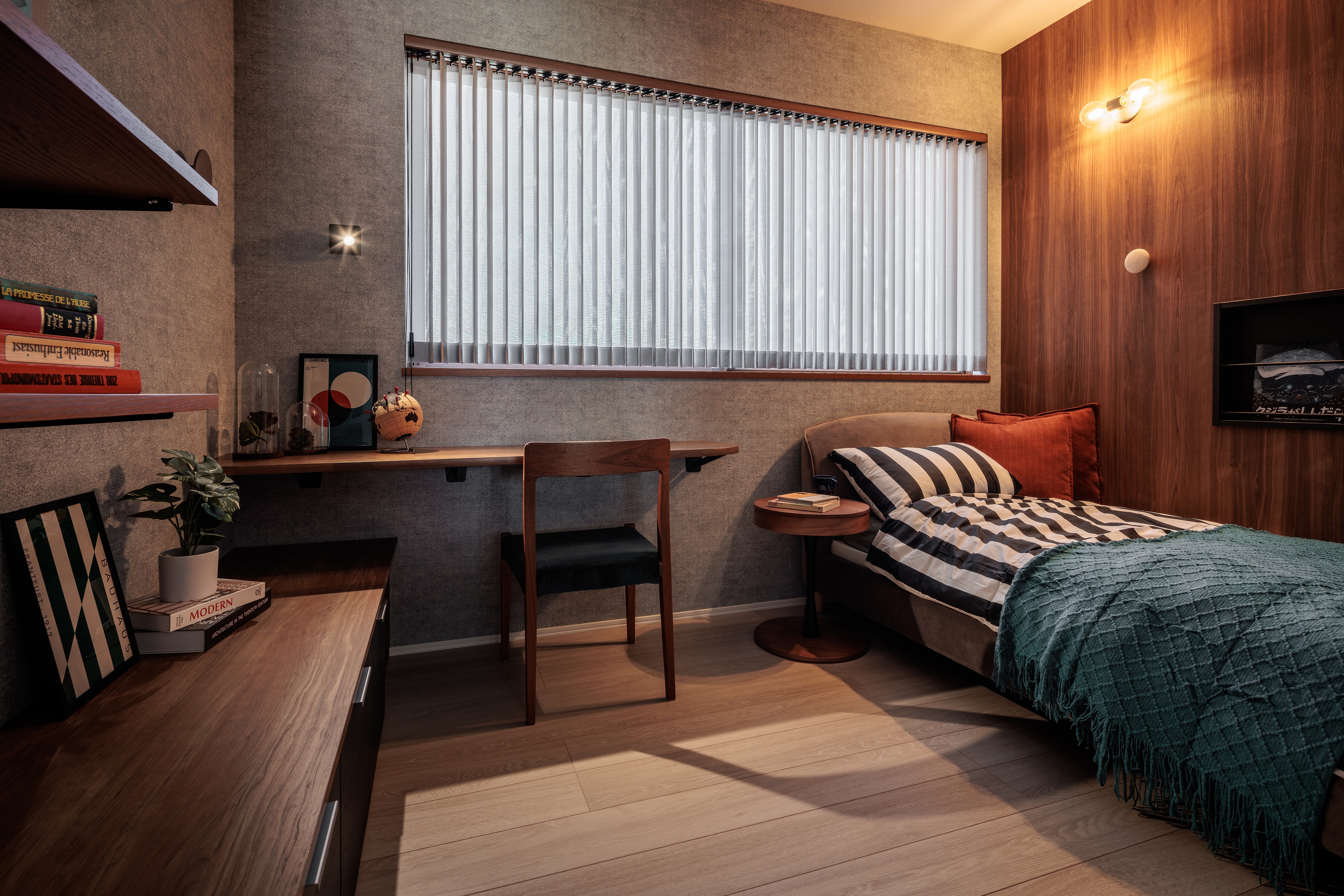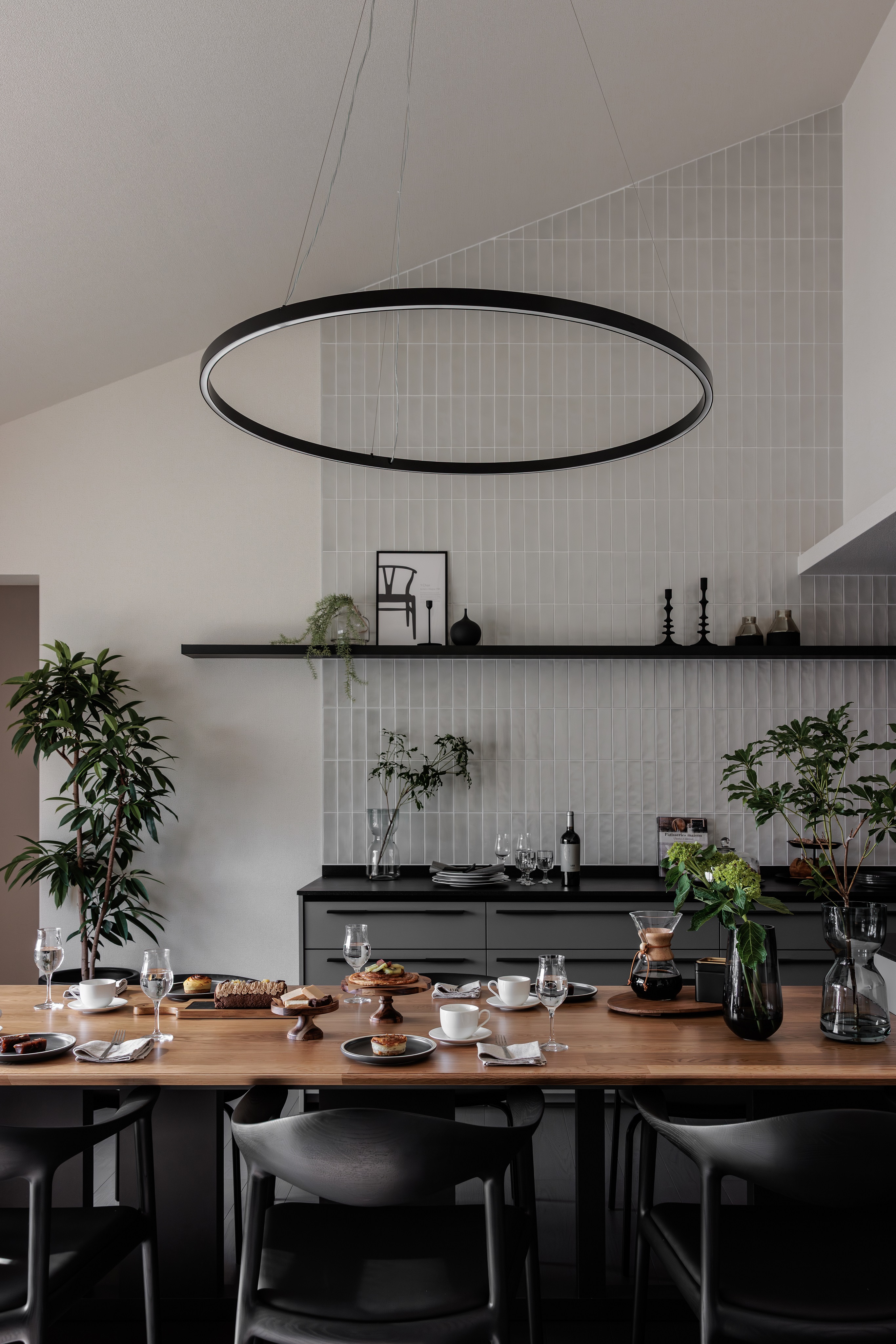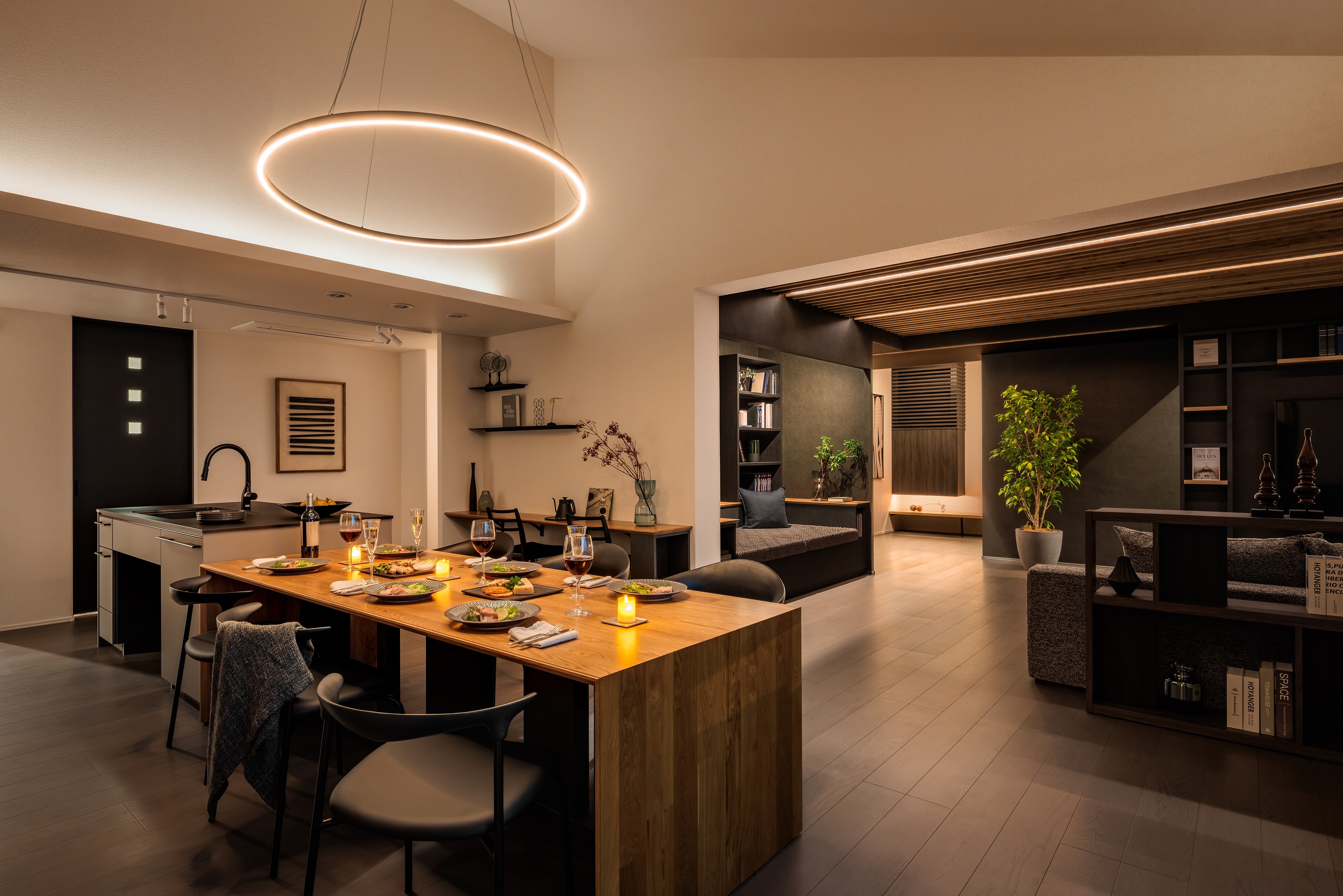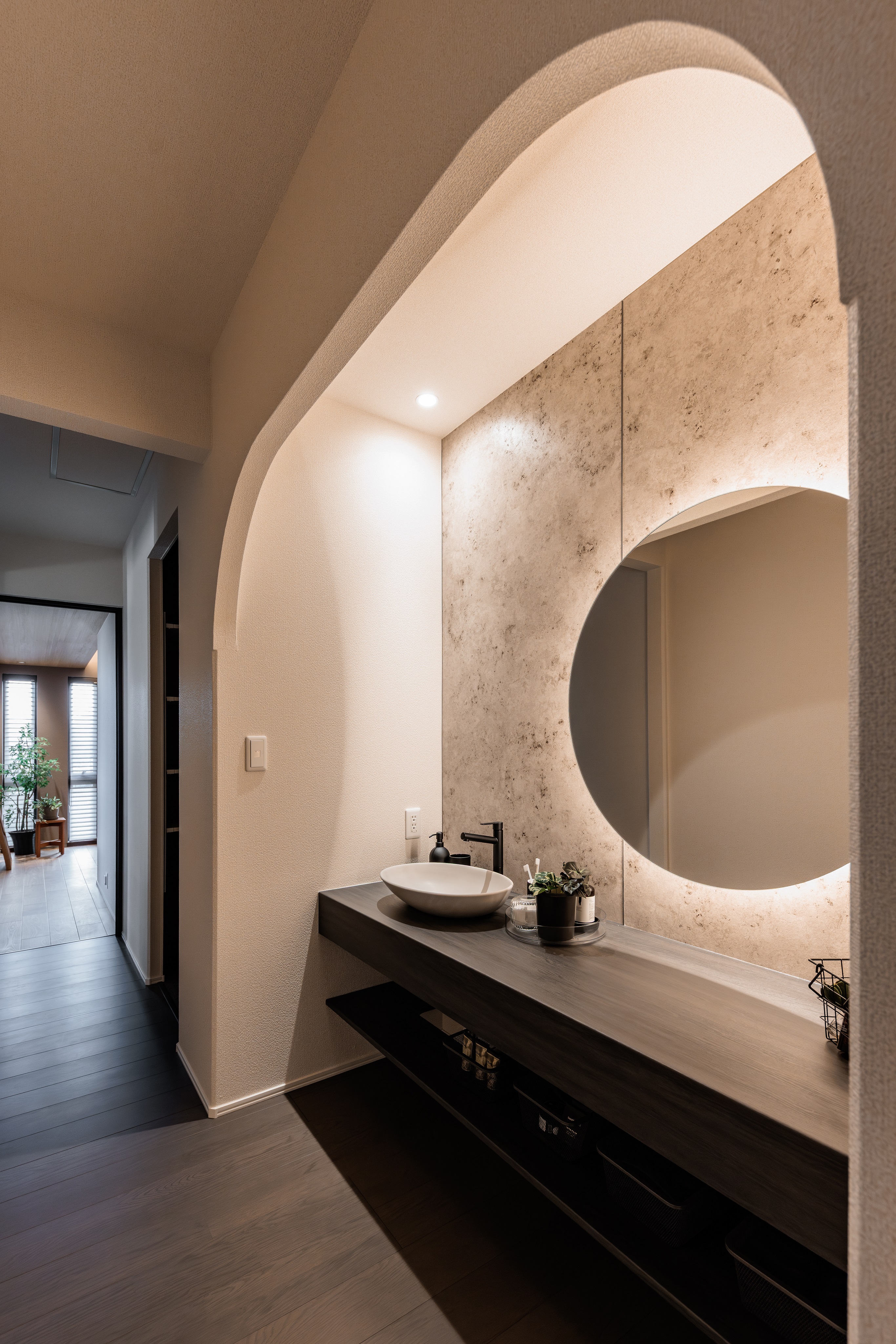 LDKはブラック×木目の空間とホワイトの空間と、繋がってはいるが仕切られているイメージにしました。暗めにゆったり出来るリビング、奥行も高さもある明るいDKで対比しました。ファミリークローゼットはコンパクトに様々なアイテムを並べ、子供室はヴィンテージ風に、家事室は趣味部屋を兼ねてマグネットボードと有孔ボードに囲まれています。メインの洗面台は円形のミラーの後ろに光を入れて幻想的に、主寝室もベッドルームにつながる壁を不規則な円形でくり抜き、洞穴に潜り込むようなイメージにしました。きっと、お気に入りの場所が見つかると思います。