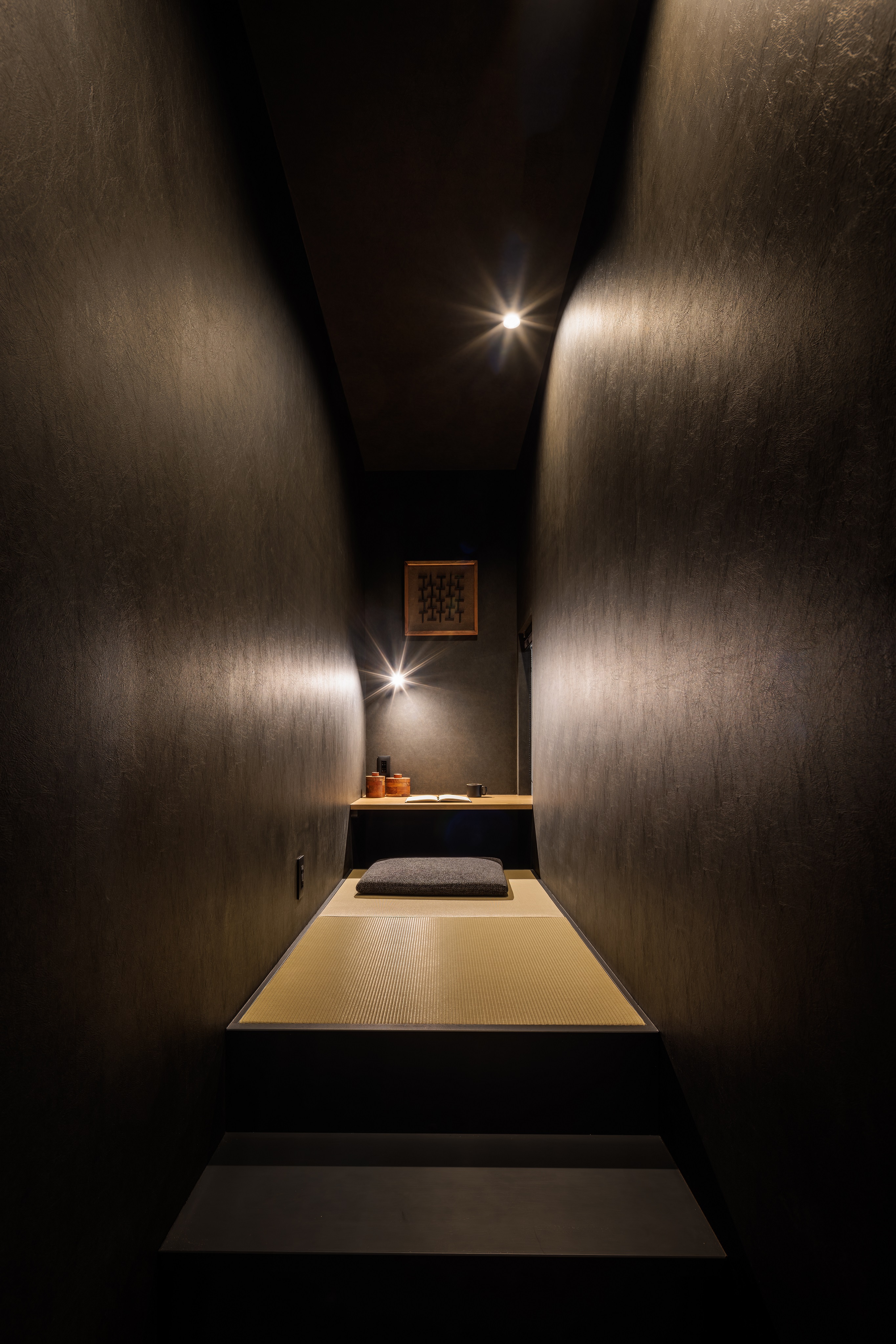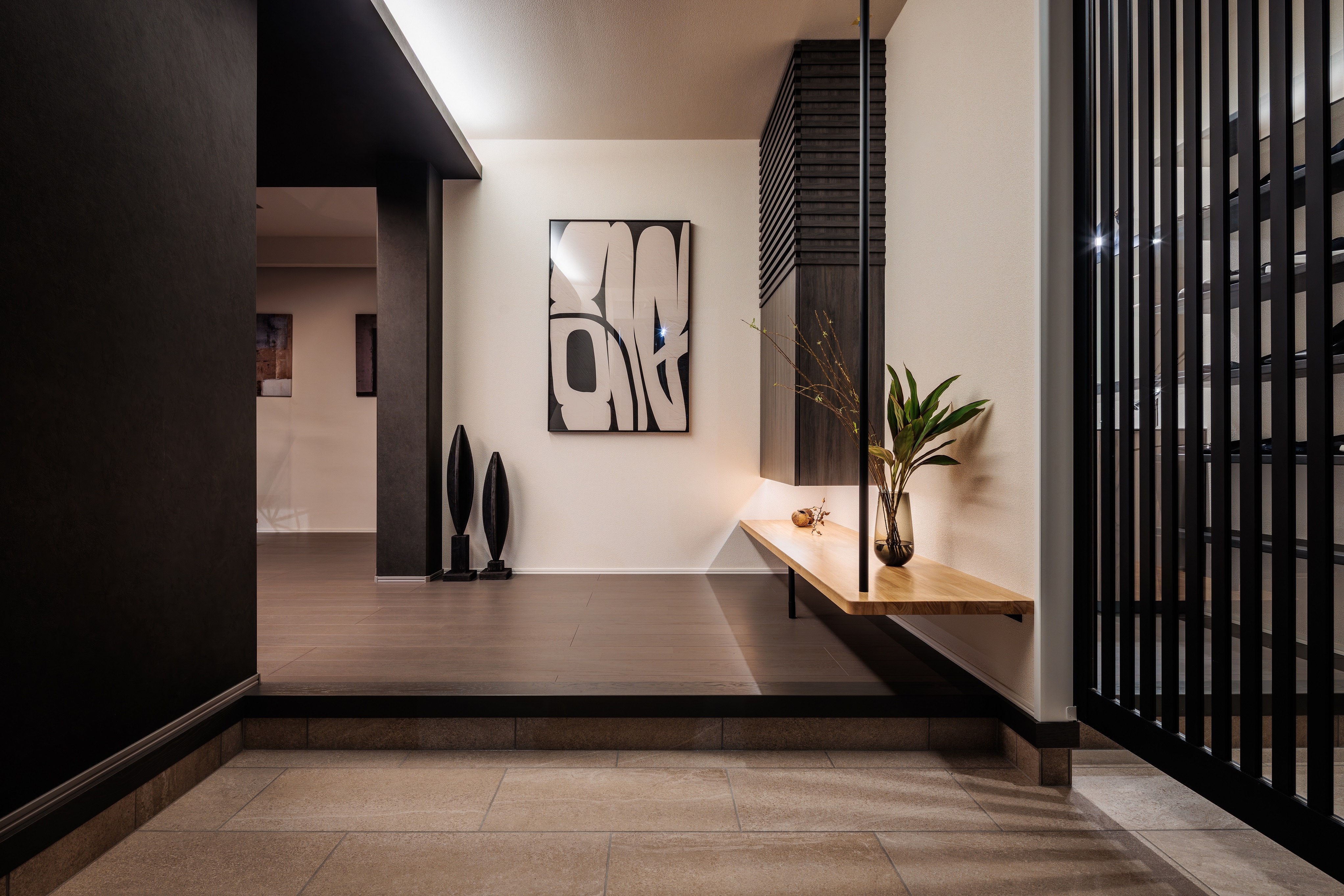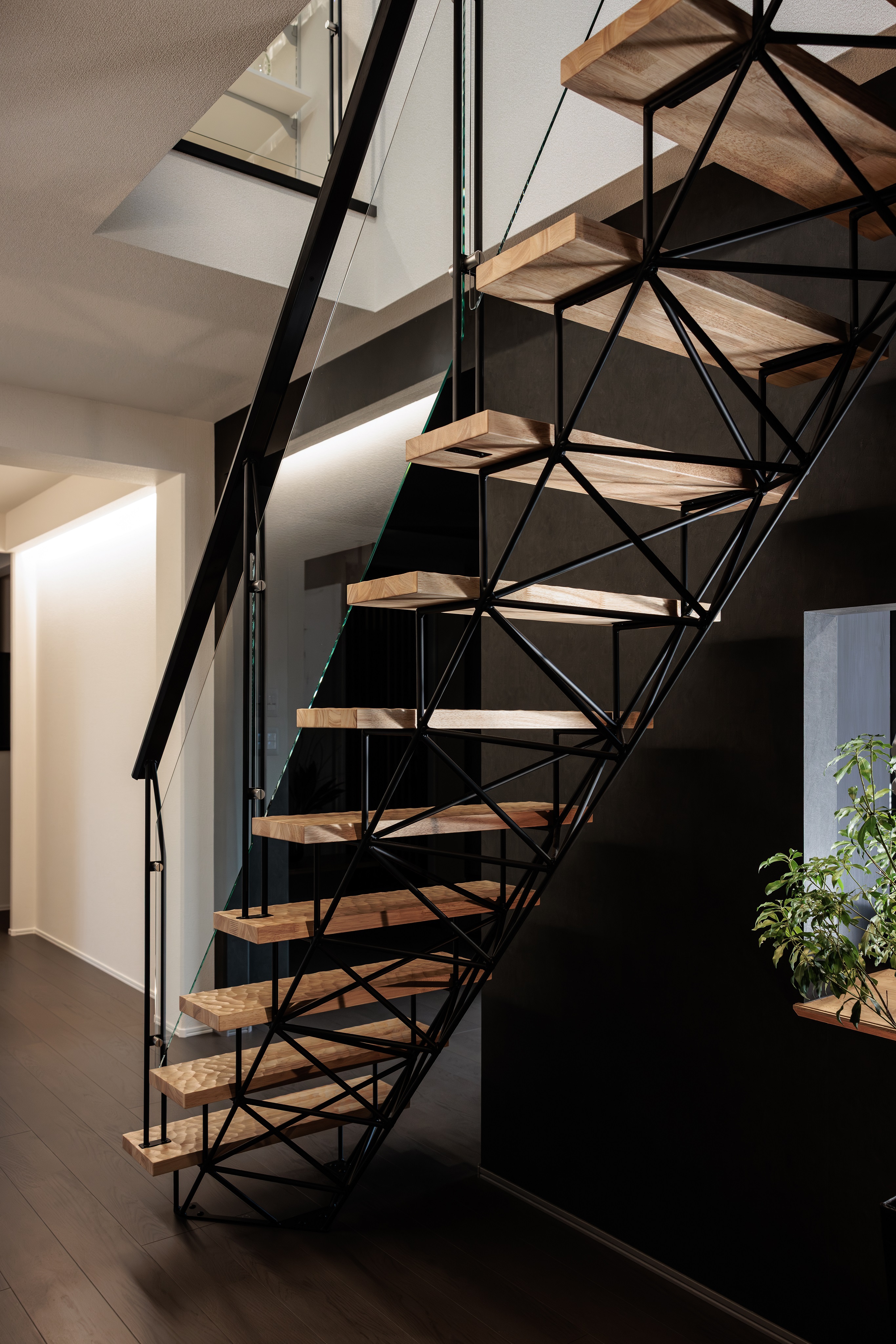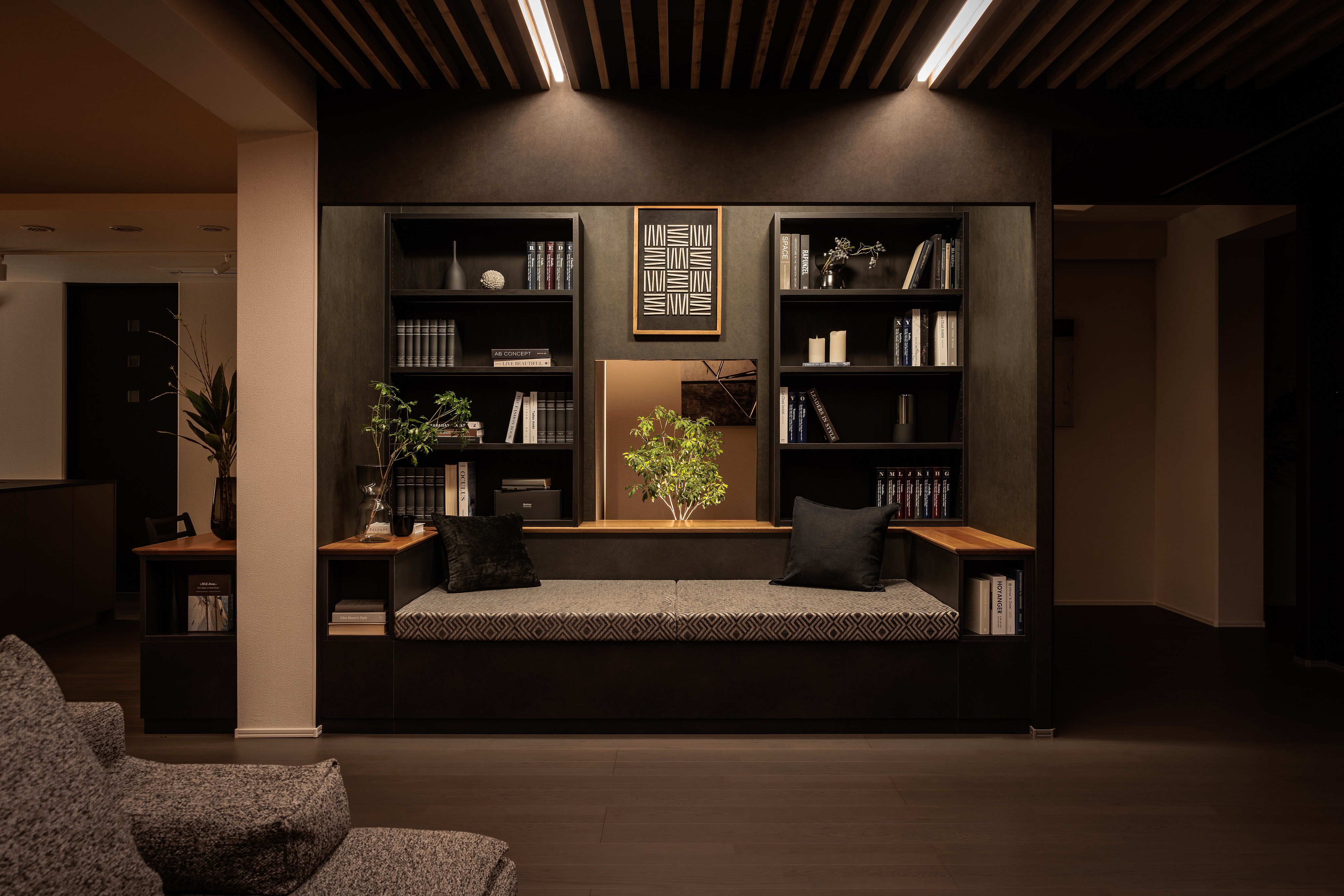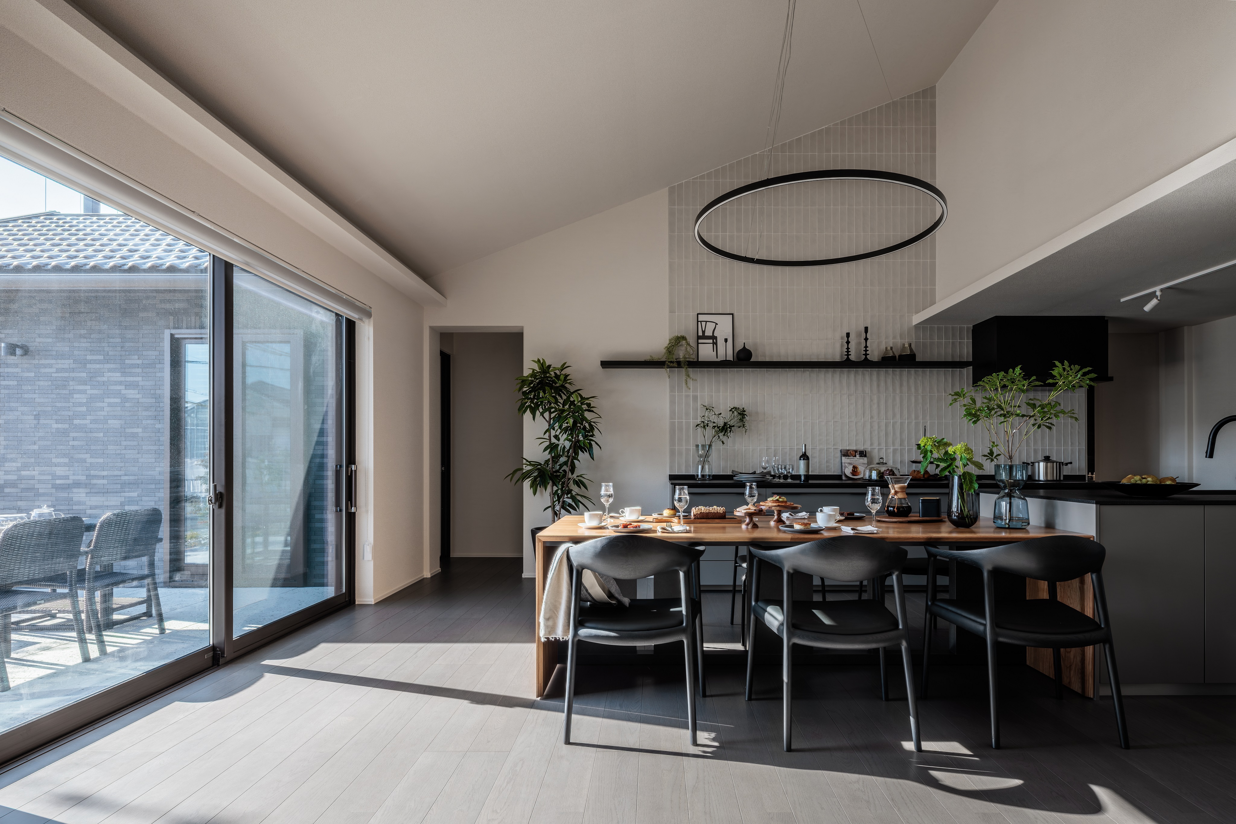LDKはブラック×木目の空間とホワイトの空間と、繋がってはいるが仕切られているイメージにしました。暗めにゆったり出来るリビング、奥行も高さもある明るいDKで対比しました。ファミリークローゼットはコンパクトに様々なアイテムを並べ、子供室はヴィンテージ風に、家事室は趣味部屋を兼ねてマグネットボードと有孔ボードに囲まれています。メインの洗面台は円形のミラーの後ろに光を入れて幻想的に、主寝室もベッドルームにつながる壁を不規則な円形でくり抜き、洞穴に潜り込むようなイメージにしました。きっと、お気に入りの場所が見つかると思います。