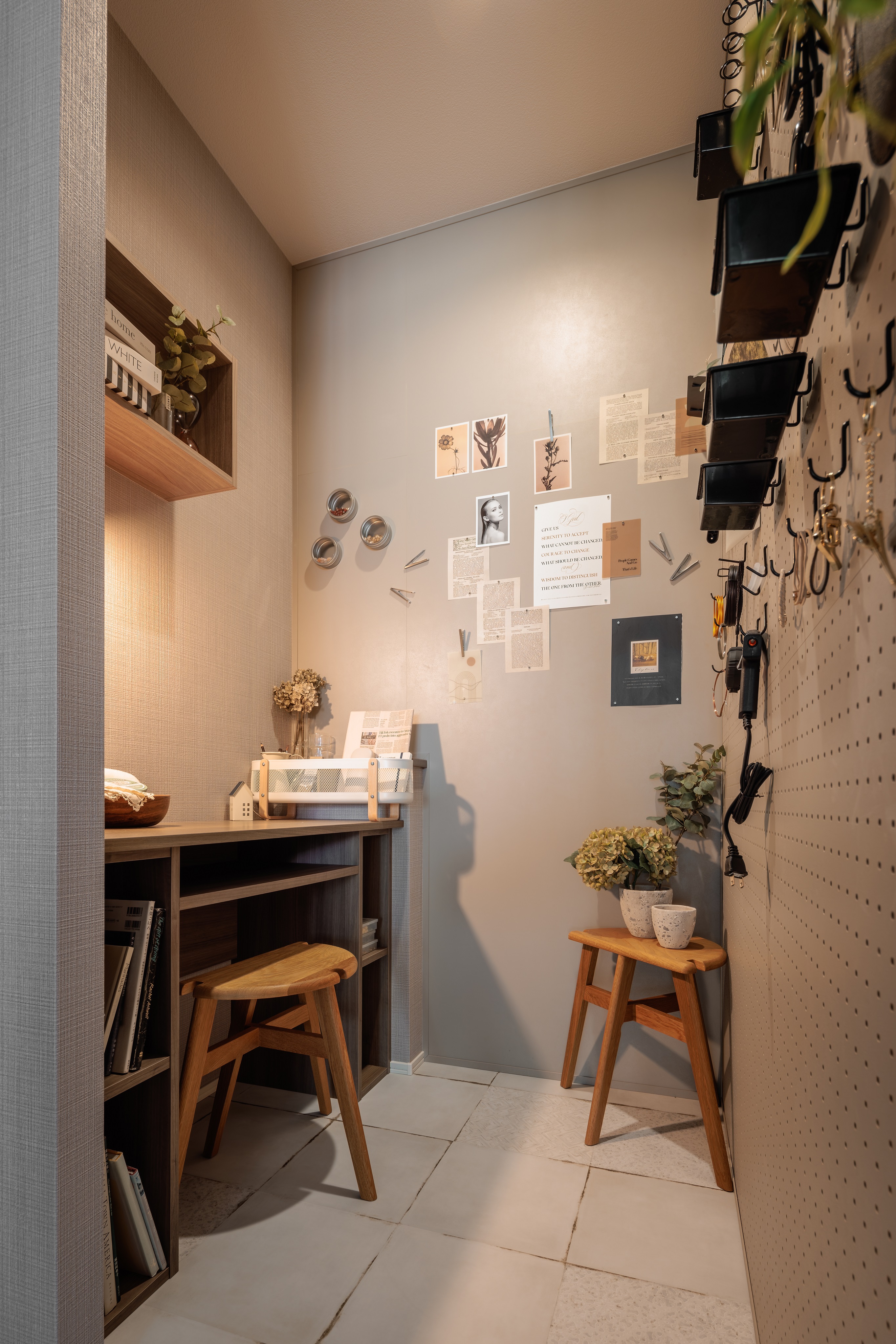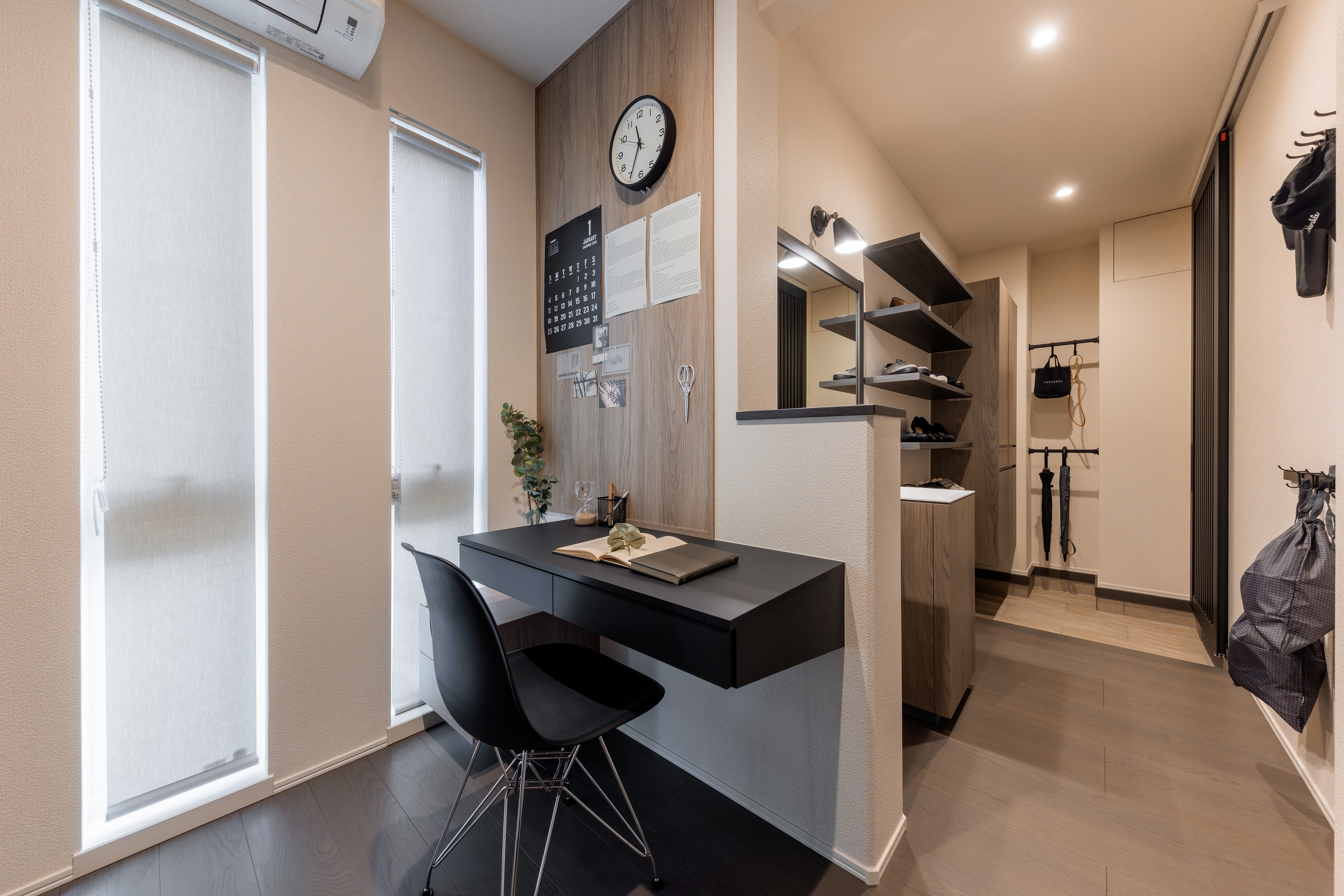 ファミリークローゼット内のデスクスペース、洞窟書斎、リビングのヌック、DKのカウンターデスク、家事室のデスクスペース等々。それらがゆるい感じで繋がっています。仕切りはあるけど、繋がっている事で、家族それぞれが別の事をしていても、お互いの存在を感じる事ができます。